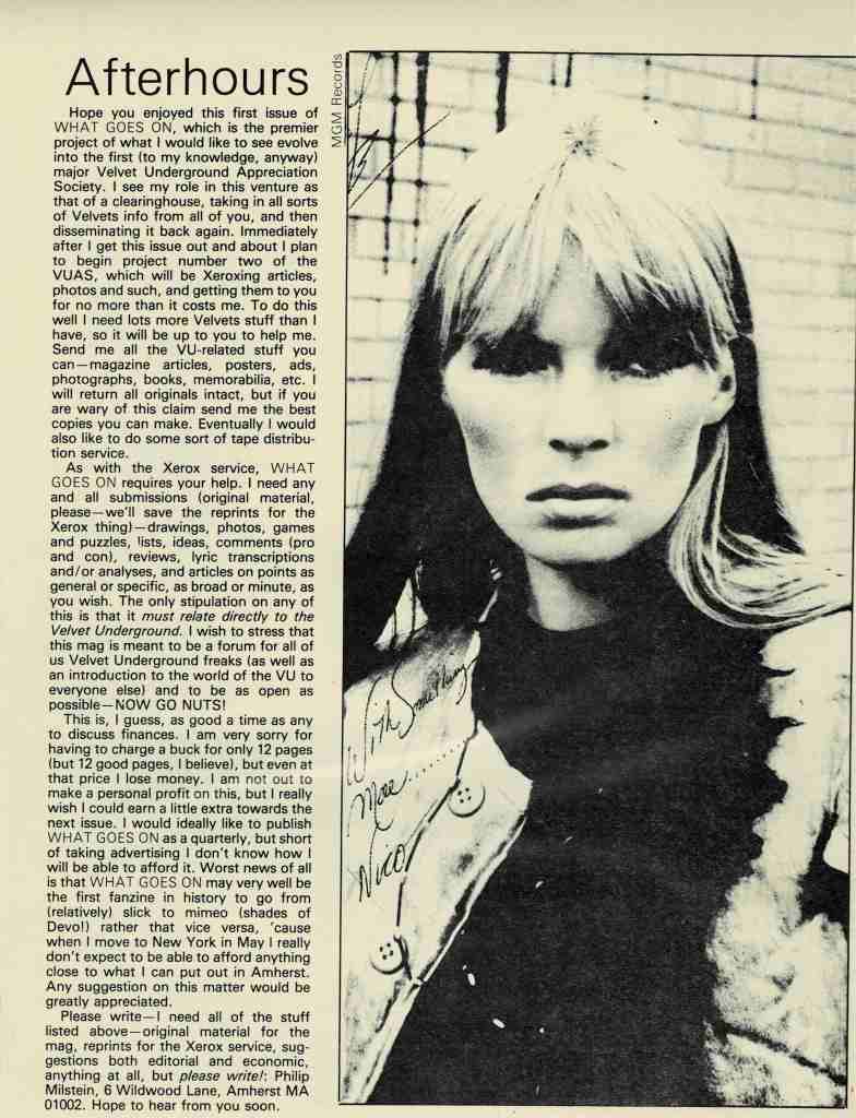In 1977, it was a hardy, newly-converted VU fan named Phil Milstein who had the wherewithal to channel his obsessions into creating the Velvet Underground Appreciation Society, which was effectively defined by a five-issue Velvets fanzine called What Goes On that he very infrequently published with others into the 1990s. This is the very first one, a 12-page xeroxed gem from 1978.
