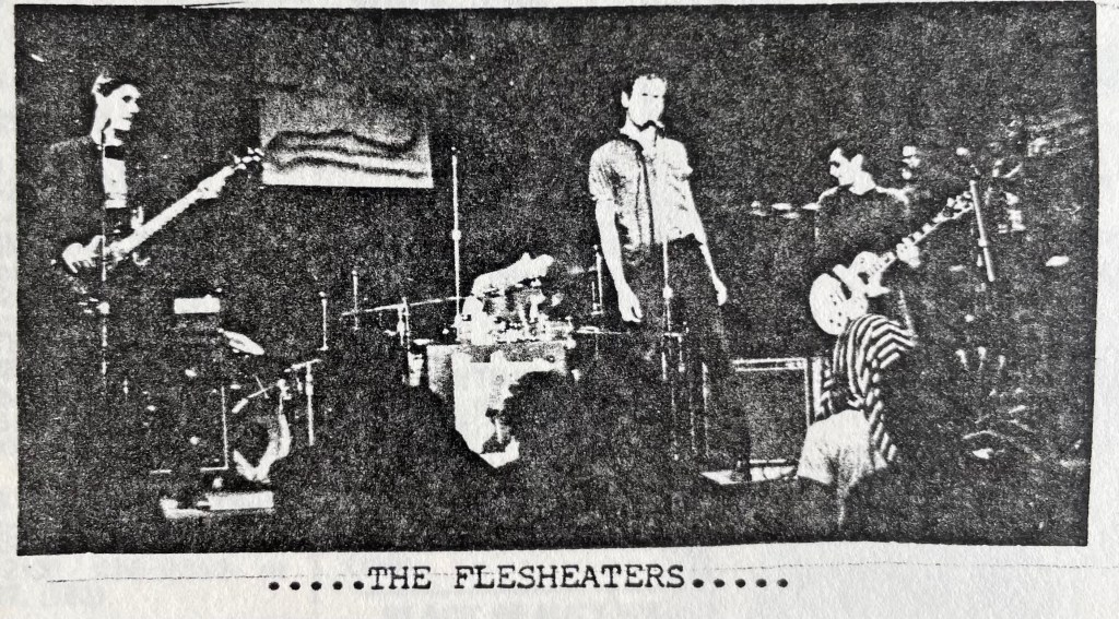 B: I lived in Cleveland until about a year ago. I just used to go to New York all the time to visit, and I figured ‘What the heck, I should just stay here’. Cleveland was great, though. There wasn’t a big scene but they had good bands. Of course the Dead Boys, and Pere Ubu, but the best was the Electric Eels. The lead singer was a polio victim, and he was really helpless-looking. They used to have a lawnmower flying off the stage. I got tapes of them with the lawn mower flying off the stage and the audience screaming. The audience used to keep time by breaking bottles or banging their head against the wall. The first time they played they all got arrested. The singer came out all wrapped in barbed wire, the bass player had long silver hair and he was wearing a dress, and this was like five or six years ago!!!”