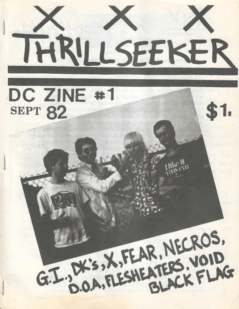 At one point in September 1982’s Thrillseeker #1, Barry Henssler of The Necros bemoans the lack of fanzines tied to the DC punk scene. I’m guessing the folks who were living their “salad days” at this time in our (my) nation’s capital don’t quite remember it that way, and indeed, there’s an entire book set to come out about DC’s punk fanzines. Thrillseeker will get some play, I am sure. It’s an excellent and incredibly comprehensive piece of on-the-ground work, edited by a guy named Tony Lombardi and with a plethora of contributors. I scanned the many names and recognized Tom Lyle from Government Issue, and Jeff Krulik – Mr. Heavy Metal Parking Lot to you.