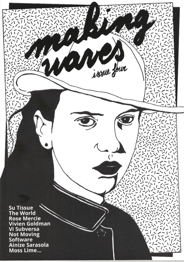 Making Waves #4 doesn’t shrink from the post-punk women they’d sorta hung their chapeaus upon in previous issues. Vivian Goldman, for one, gets a MW interview grilling, and we’re all the better for it. Vi Subversa, the woman who fronted Poison Girls and who garnered much attention for being a fortysomething mom whilst doing so, also gets a tribute piece. There are other things on creative women from multiple disciplines whom I don’t know anything about, and, incongruously, a playlist of 70s power pop by dudes to check out.