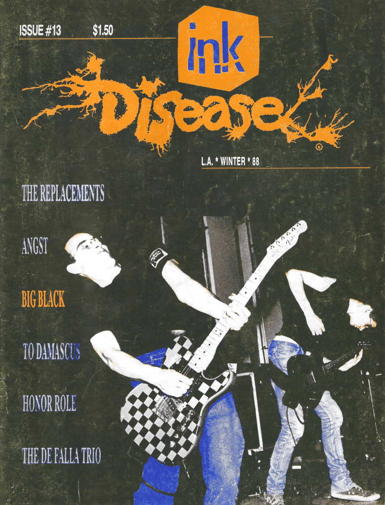 Not gonna lie, as they say, but I thought Ink Disease was pretty weak when it was around in the late 80s, and only cover stories like this one, or the one with The Weirdos, caused me to pick it up at the time. They covered the shitty stuff rather shittily, like a sub-sub-Flipside if memory serves, and yet something must have caused me to hold on to a couple of them all this time. The fanzine was well distributed, and easy to find across LA and elsewhere, and had all the usual ads from important record labels like Taang!, Boner and Fartblossom Enterprises. If you can believe it, I really haven’t looked at an issue of this since that time. Perhaps it might make sense to pry Ink Disease #13 out of cold storage, and see if it’s aged as well as that Châteauneuf-du-Pape I laid down 35 years ago?