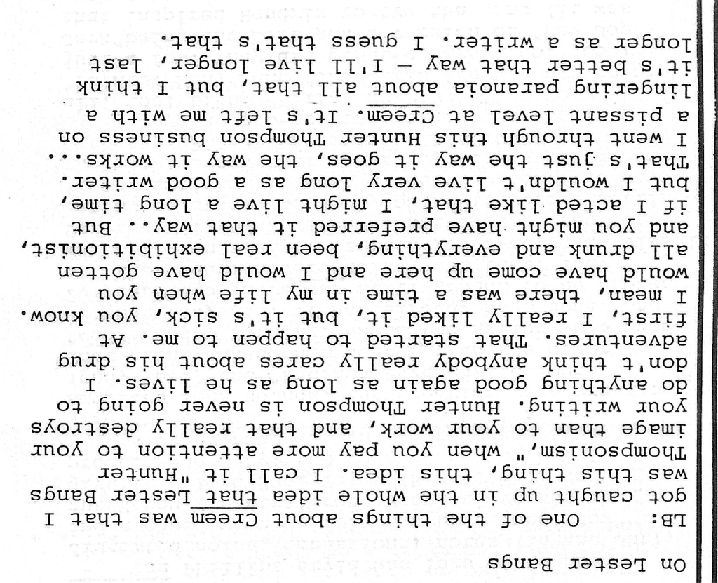 The star diamond in this one is Lester Bangs interview excerpts from a talk teenage DeRogatis had with him just over 2 weeks before his death in 1982. Excellent stuff. Take a look at this particular bit of Lester-on-Lester; it is kind of a drag and highly ironic, given that he’d be dead sixteen days later: