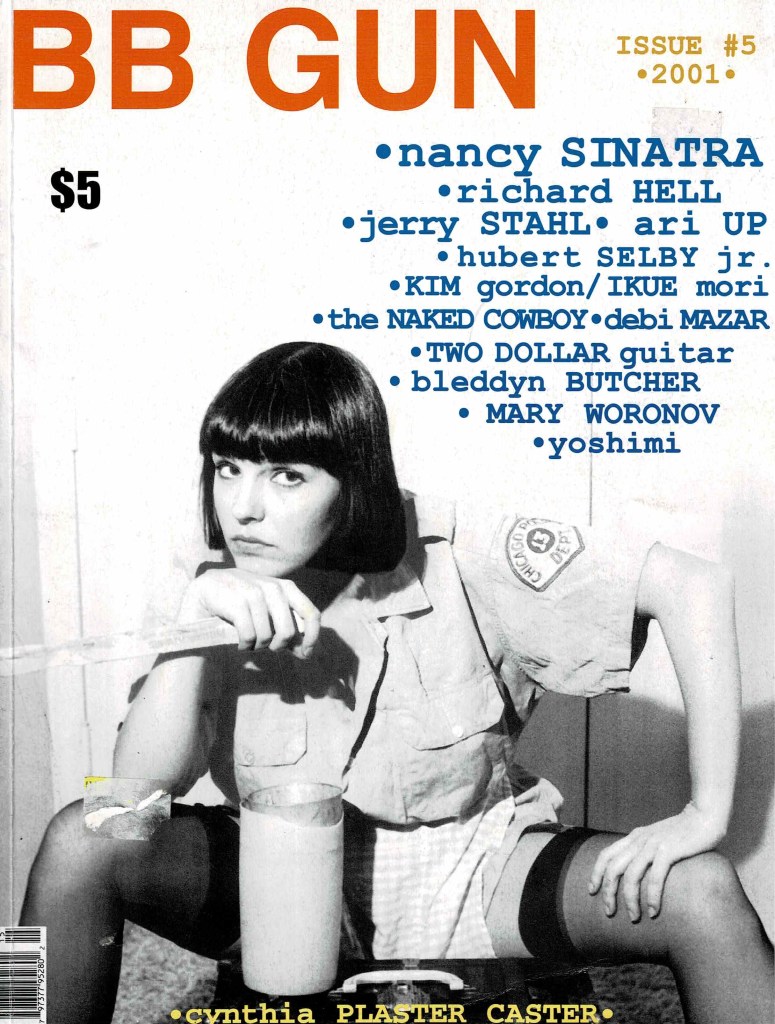 I have a couple issues of Bob Bert’s late 90s/early 2000s BB Gun in the files and on balance I’m glad to have them around, though its “underground sleaze” horndog aesthetic was pretty off-putting even in its day. At its worst, it was sort of a lower east-side NYC parallel to the “lad’s mags” of the era, what with its lascivious droolings over various alterna-females and the constant written bloviations of Lydia Lunch. Thankfully, BB Gun #5 from 2001 is rarely at its worst, and can be much more generously read as a “glossy entertainment yearly”, albeit one drawn from fringe sub-scenes across music, film and literature, with many if not most participants plucked from Bob Bert’s most obvious orbits (i.e. Sonic Youth, Pussy Galore and Lydia Lunch, all of whom he drummed for).