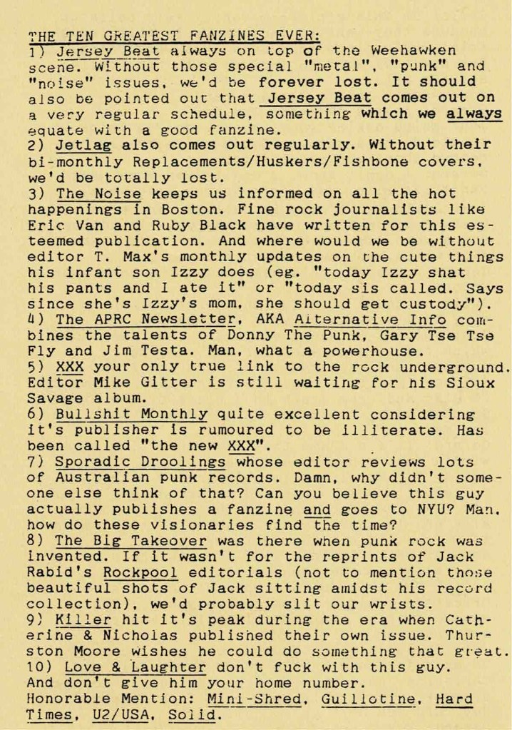 I mean, it’s all so giddy and dumb that it’s still funny to this day: “…Another one of last issue’s heroes, Brett Milano, has been spotted wearing a bicycle helmet while walking down the street…”, taken from a three-dot gossip column that was embedded in many of the issues called LIES**LIES**LIES**LIES. Milano, Billy Ruane and Mike Gitter. Man, if it weren’t for Conflict and Forced Exposure, I wouldn’t have ever known who these lustily mocked people were, and what their horrific scene crimes might have been. I guess Cosloy had a college radio show at this point, though he’s all too quick to mention to a letter-writer that this is not how he’s getting his records to review.